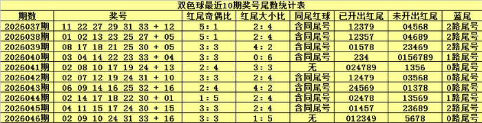 最近10期双色球红球尾数0-9开出频次分别为:尾数2出现10个,尾数4出现9个,尾数1 3 7出现7个,尾数0 9出现5个,尾数5 8出现4个,尾数6出现2个,尾数0-9全部出现。本期注意尾数:135,注意尾数3、5开出同尾红球。
